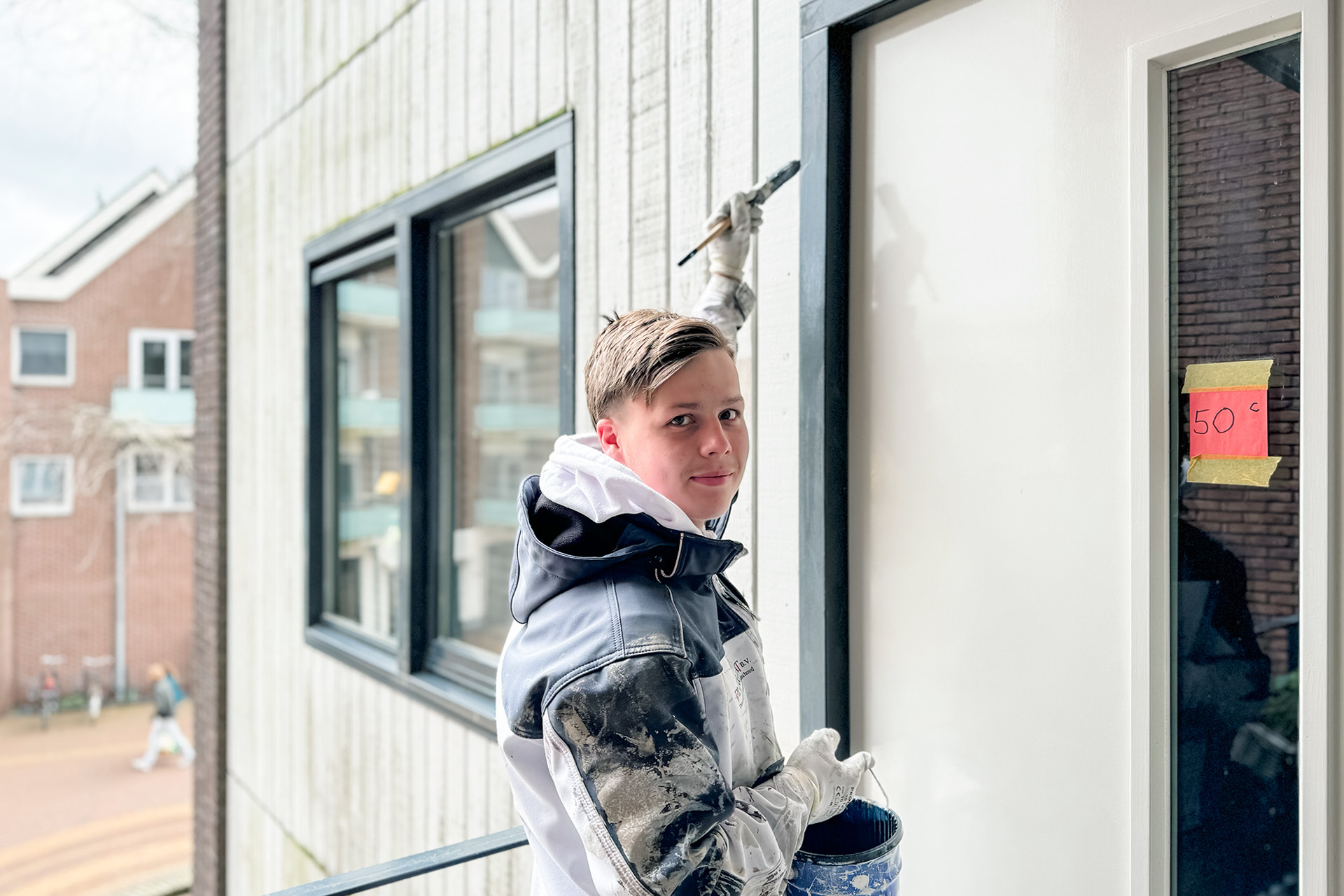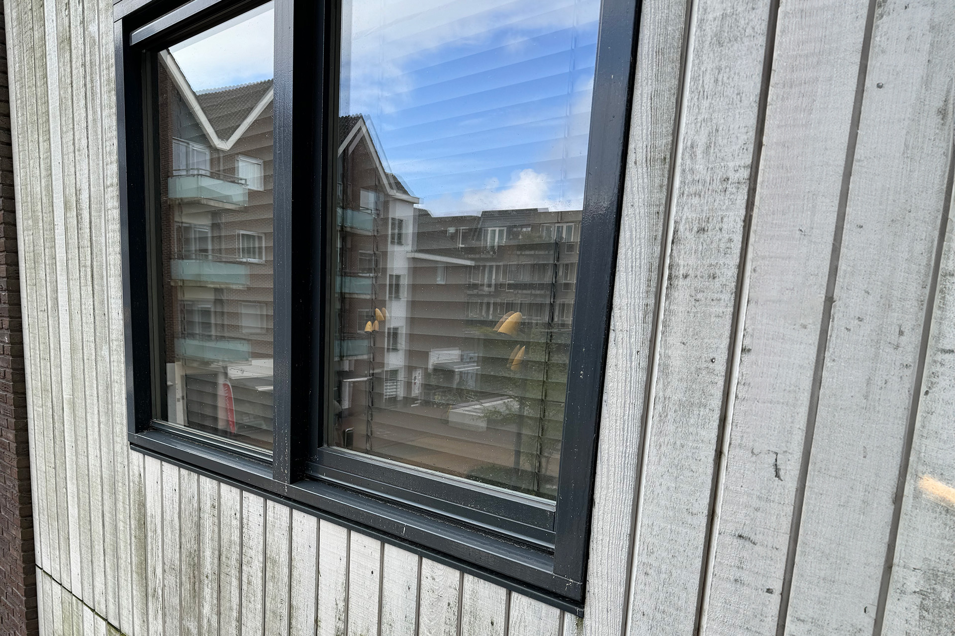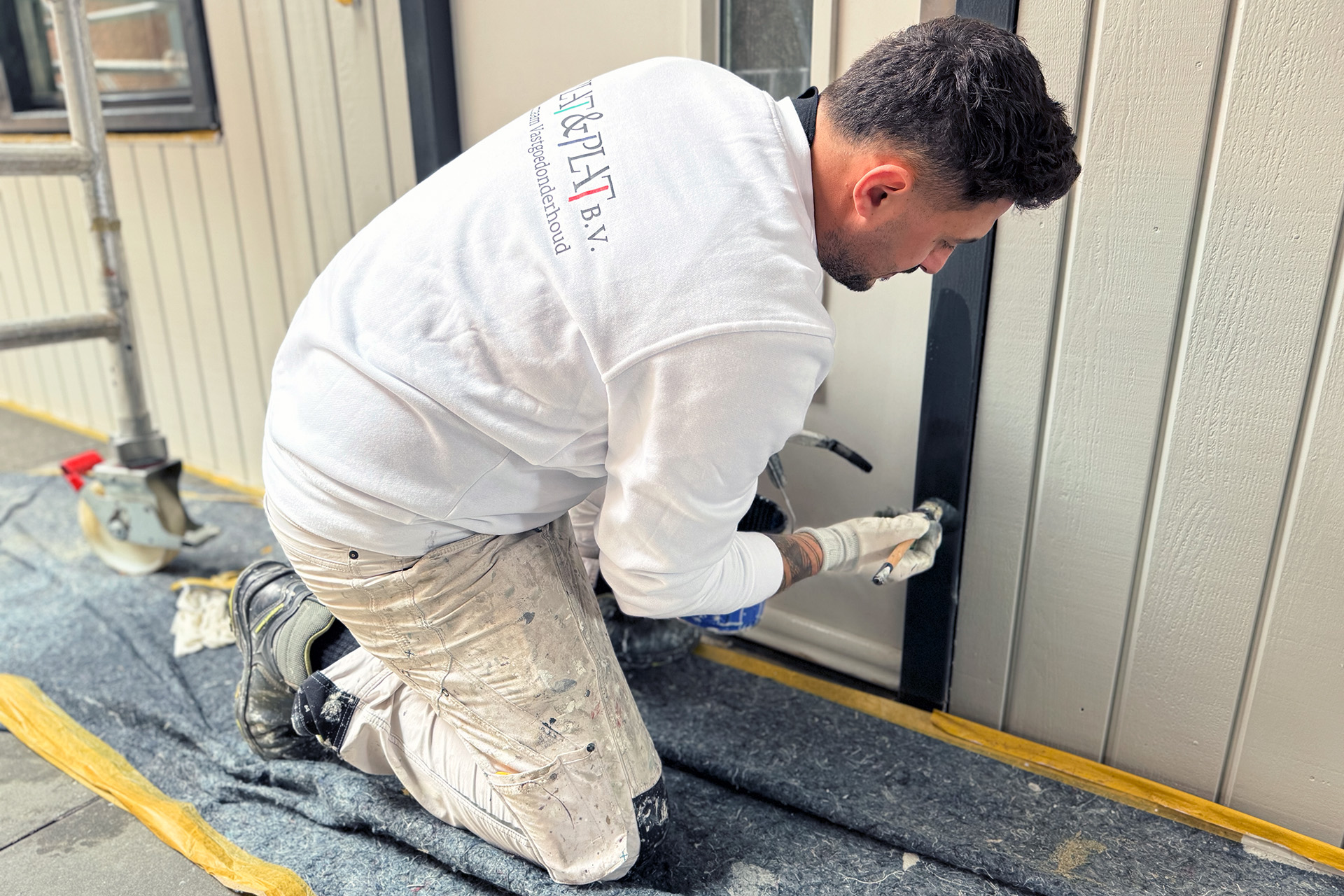 De houten rabatdelen van de 62 woningen vertoonden tekenen van verweer, waardoor de poreuze houtstructuur de ondergrond niet langer voldoende beschermde. Op de foto's van de oude situatie was duidelijk te zien dat zich veel vuil had opgehoopt. Ons team begon met een grondige reiniging van de rabatdelen, gevolgd door mechanisch schuren om een stabiele ondergrond te creëren. Daarna brachten we een grondlaag aan en werkten we af met twee lagen Jotun verf. Deze hoogwaardige Noorse verf is speciaal ontworpen voor rabatdelen en staat bekend om zijn vochtregulerende en beschermende eigenschappen.