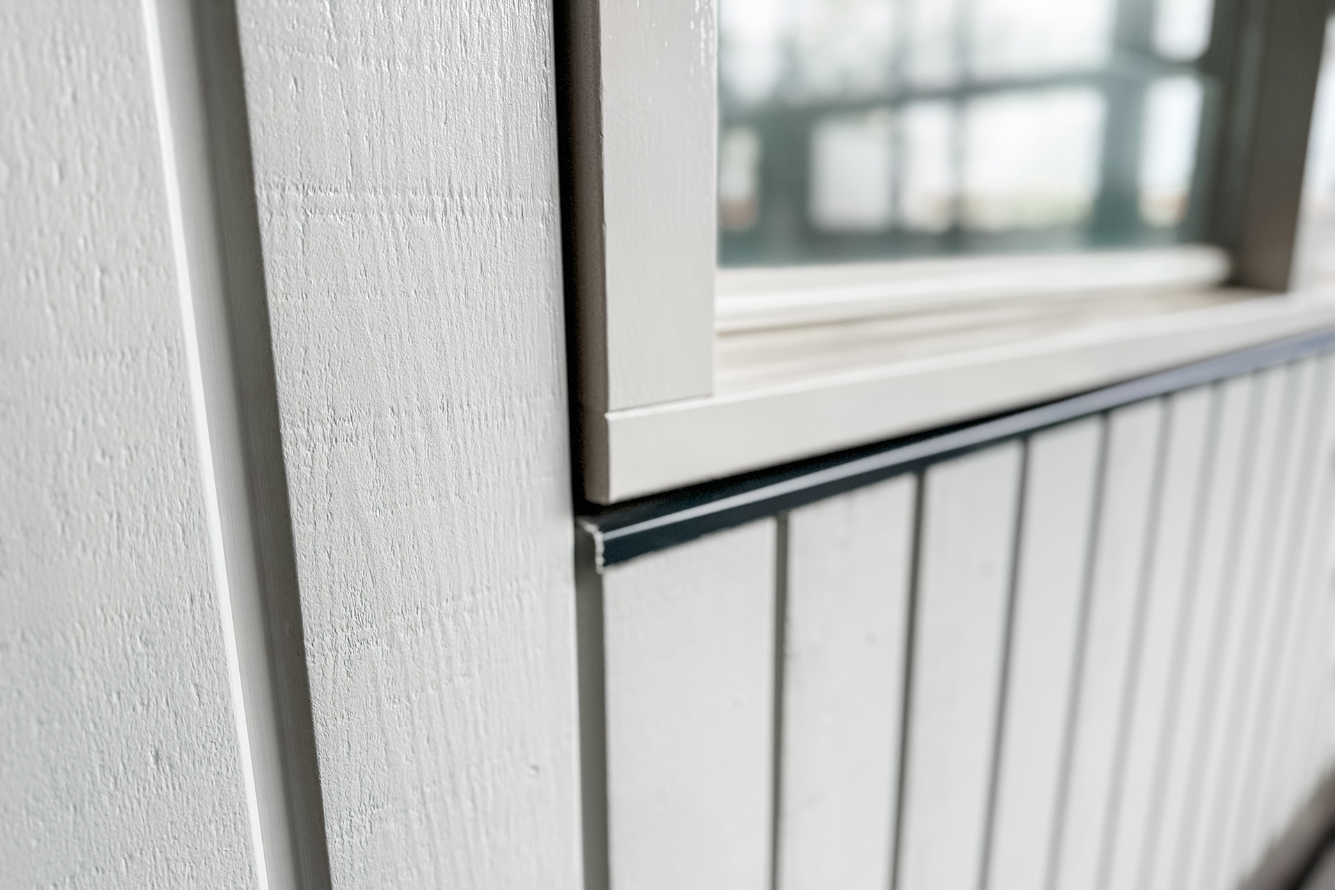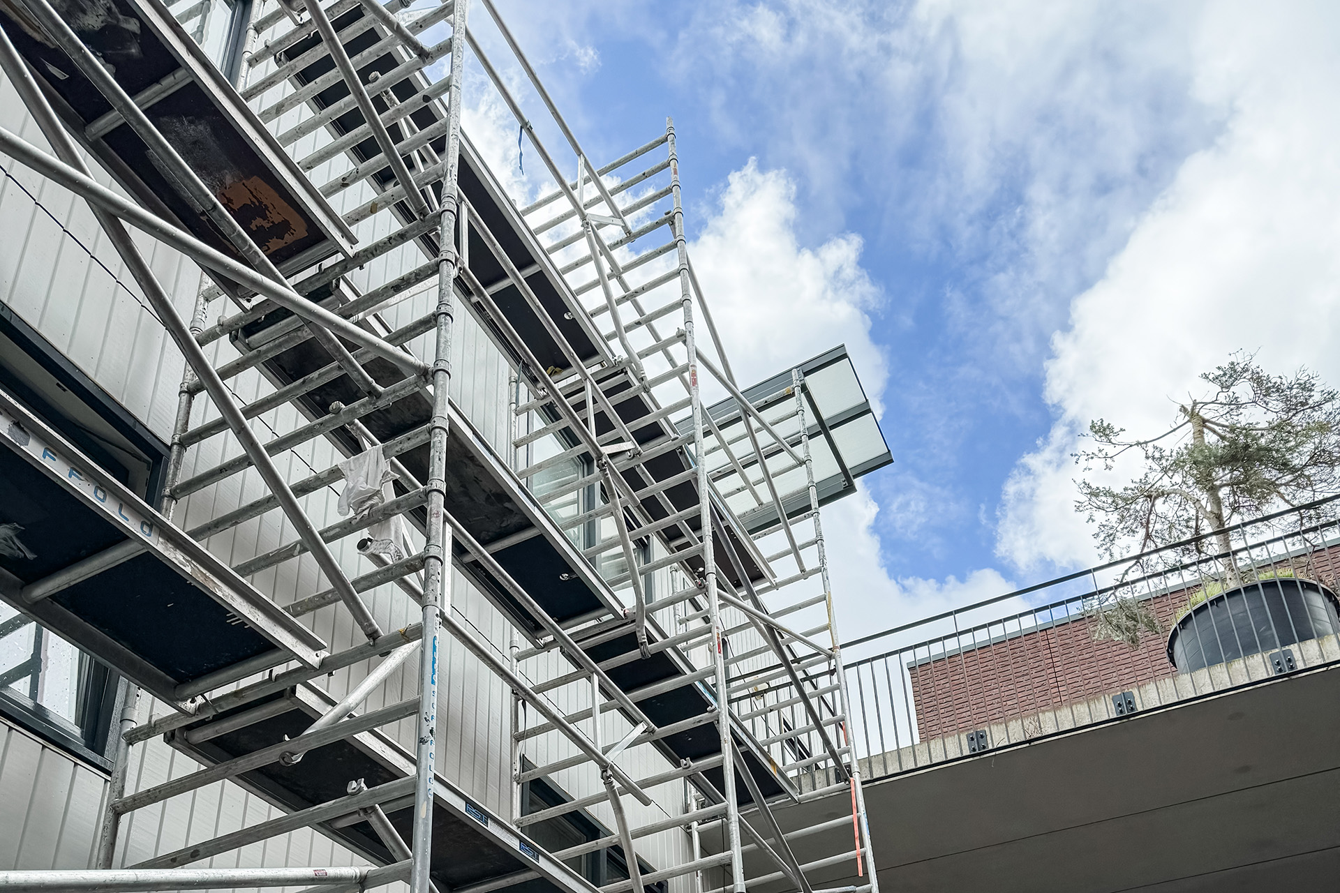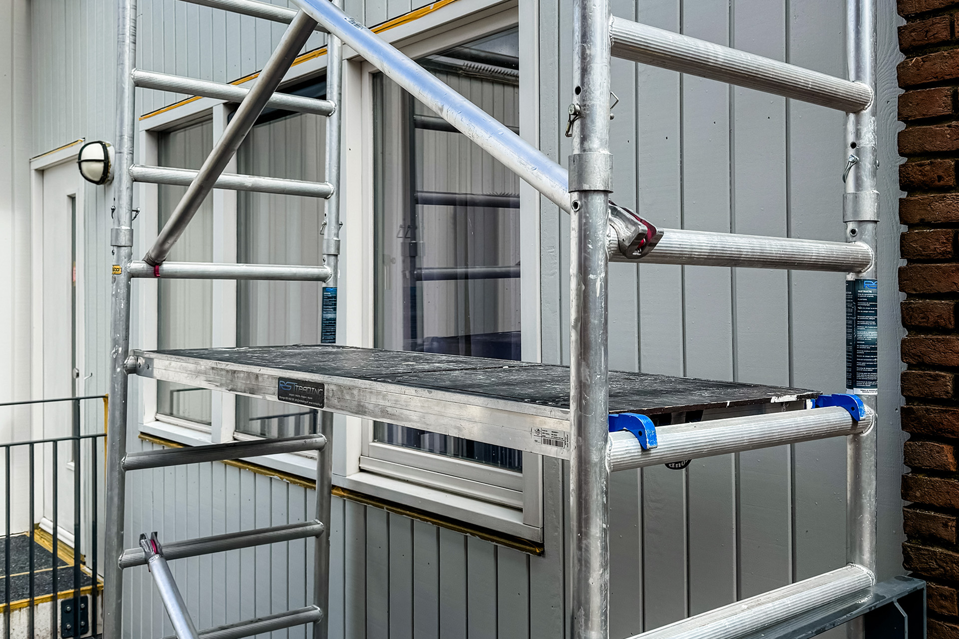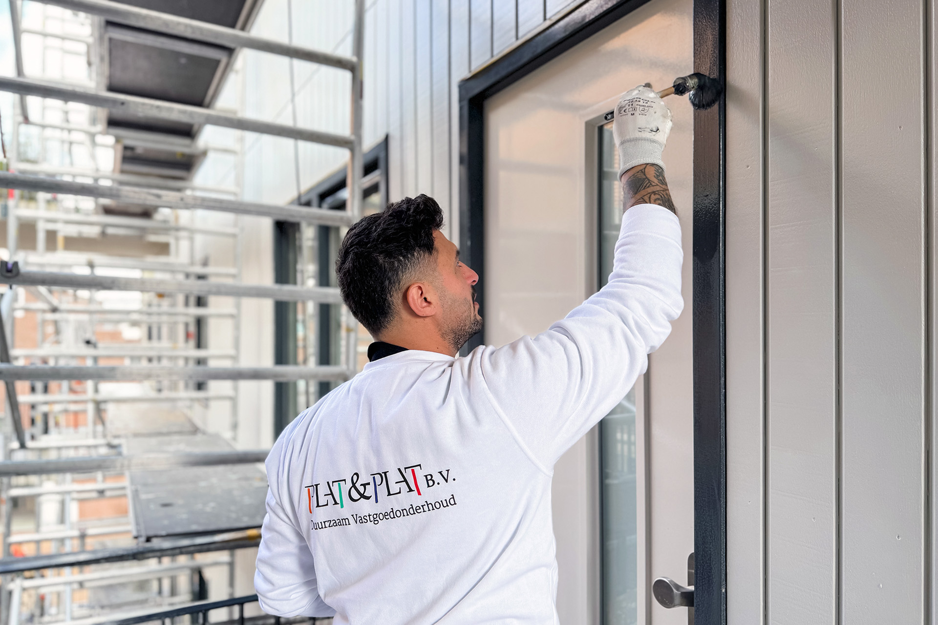 De houten rabatdelen van de 62 woningen vertoonden tekenen van verweer, waardoor de poreuze houtstructuur de ondergrond niet langer voldoende beschermde. Op de foto's van de oude situatie was duidelijk te zien dat zich veel vuil had opgehoopt. Ons team begon met een grondige reiniging van de rabatdelen, gevolgd door mechanisch schuren om een stabiele ondergrond te creëren. Daarna brachten we een grondlaag aan en werkten we af met twee lagen Jotun verf. Deze hoogwaardige Noorse verf is speciaal ontworpen voor rabatdelen en staat bekend om zijn vochtregulerende en beschermende eigenschappen.